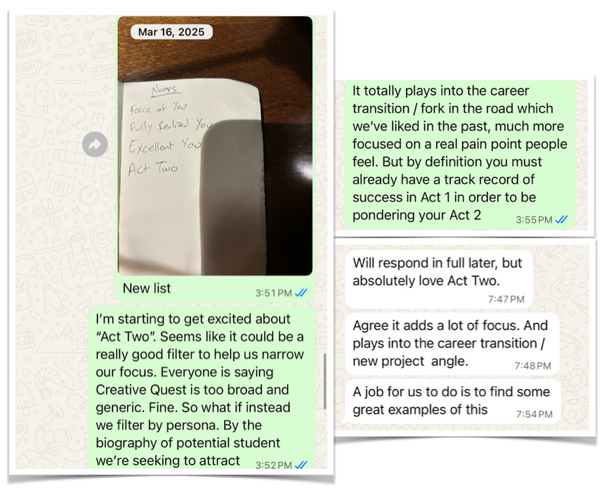During these travels, Dan and I are also having ongoing calls with potential students. A few are peak moments. One standout is Linart Seprioto, a WOP alum from the Philippines who “felt the internet” for the first time in our program. He leaves an insightful comment on a LinkedIn post, which turns into one of the most productive feedback calls of the summer. Before long he’s helping Dan and I with marketing efforts in a part-time role. Major highs also happen when I chat with someone who hasn’t taken Write of Passage before but loves the concept of Act Two. We stack up a few verbal commitments. Momentum!
